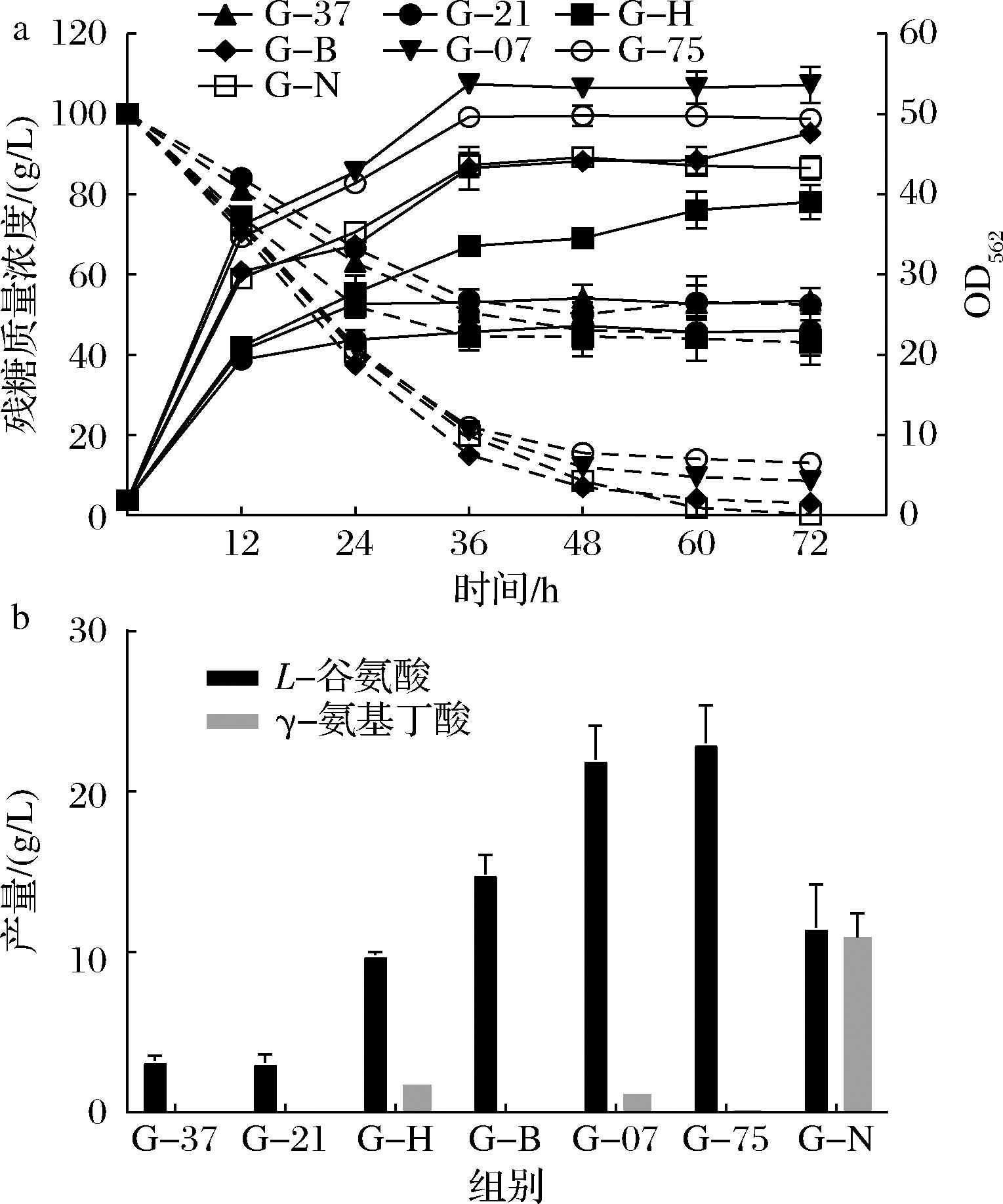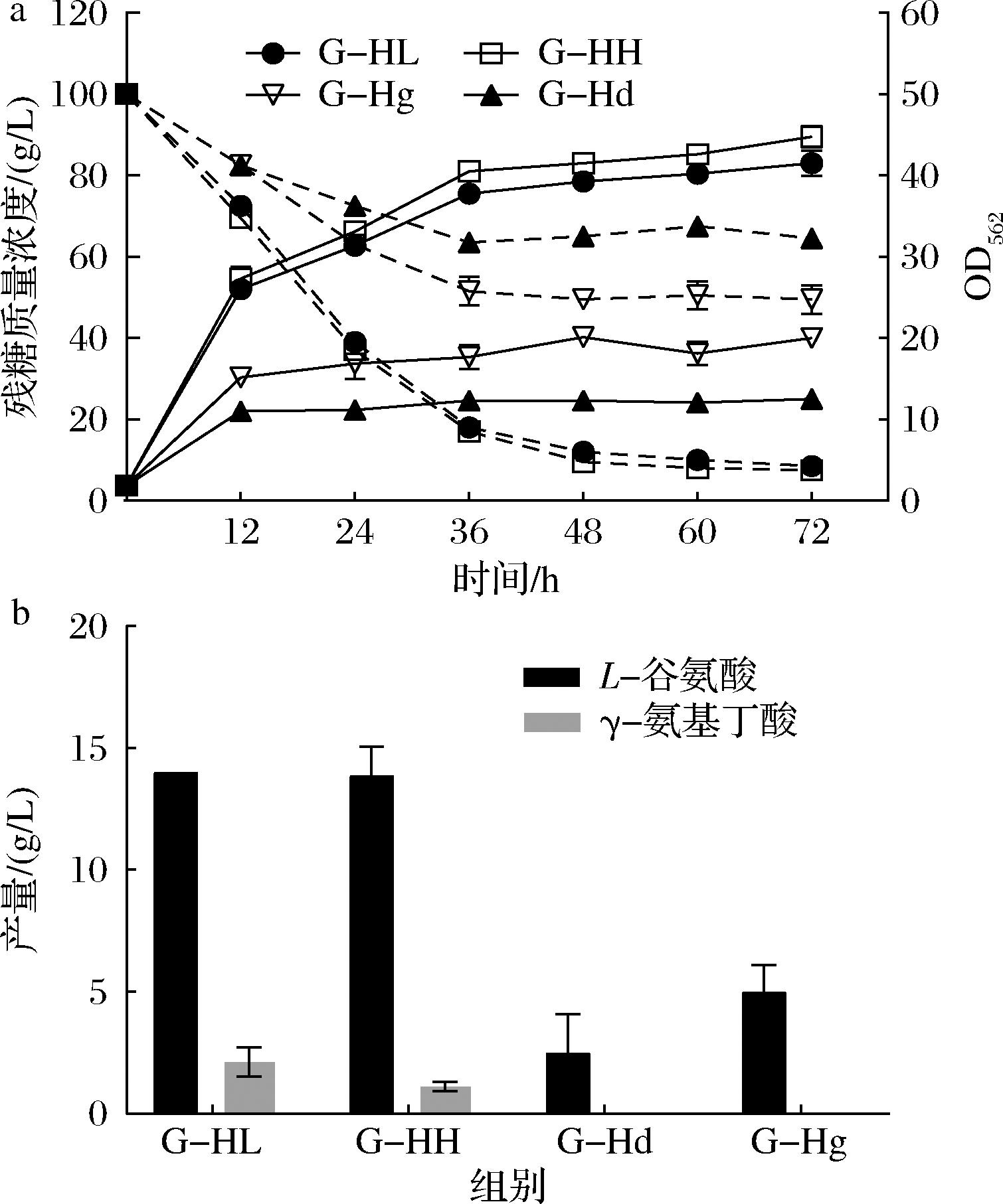 分子伴侣是一类与其他蛋白质相互作用并帮助其进行折叠和组装的蛋白质,但是不作为最终功能结构的一部分。分子伴侣主要具有促进折叠和防止蛋白质聚集的功能。分子伴侣与靶蛋白共同作用时,可以帮助靶蛋白增强构象和功能的稳定性,以增强目的产物的生产[23]。在本研究中,表面展示后GABA产量显著下降,这可能是由于锚定基序和LsGAD组成的融合蛋白出现了折叠错误或聚集的情况,为了促进融合蛋白的折叠,考虑利用谷氨酸棒杆菌本身的分子伴侣GroEL-GroES复合物和DnaK-GrpE-DnaJ复合物[24]分别与融合蛋白进行共表达,获得了菌株G-Hg和G-Hd。在不调节pH的发酵方式下,结果表明,在融合蛋白和分子伴侣共表达后,菌株G-Hg和G-Hd的生长和葡萄糖摄取均受到了严重抑制(图3-a),L-谷氨酸的积累较少,且均未产生任何的GABA(图3-b)。之前的一项研究结果表明,分子伴侣的表达对细胞的生长有轻微的抑制[24],本研究中出现的显著抑制可能是由于融合蛋白和分子伴侣的表达强度较强,且融合蛋白结构复杂,它们的合成都需要消耗大量的能量和氨基酸,这增加了代谢负担,抑制了细胞生长。