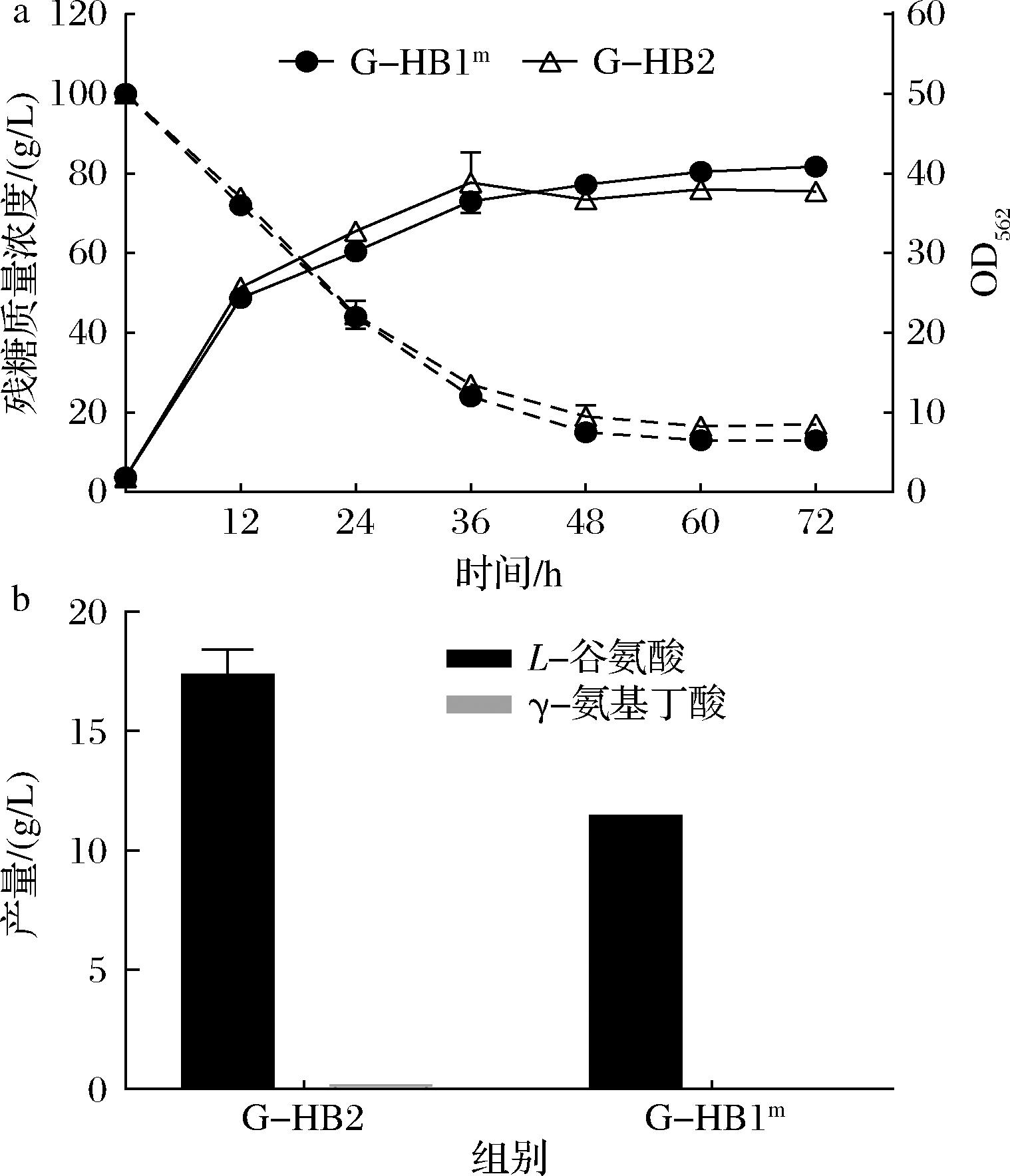 a-菌株G-HB2和G-HB1m的细胞生长和葡萄糖消耗情况;b-菌株G-HB2和G-HB1m的L-谷氨酸和GABA产量