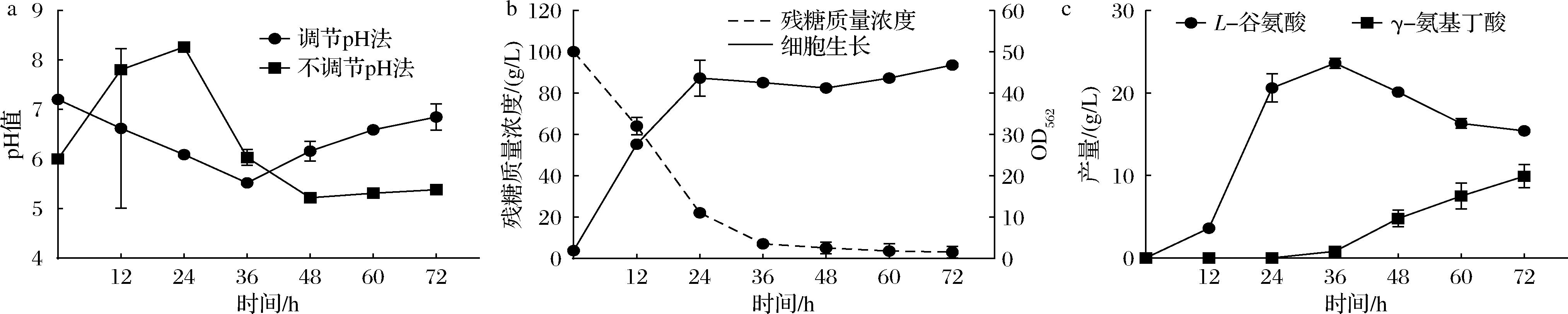 a-调节pH法和不调节pH法在发酵过程中pH的变化;b-菌株G-HL的细胞生长和葡萄糖消耗情况;c-菌株G-HL的L-谷氨酸和GABA产量