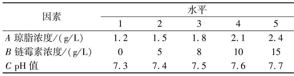 因素水平12345A 琼脂浓度/(g/L)1.21.51.82.12.4B 链霉素浓度/(g/L)0581015C pH值7.37.47.57.67.7
