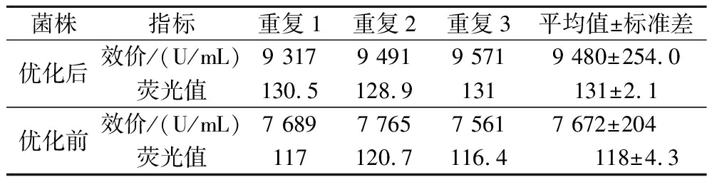 菌株指标重复1重复2重复3平均值±标准差优化后效价/(U/mL)9 3179 4919 5719 480±254.0荧光值130.5128.9131131±2.1优化前效价/(U/mL)7 6897 7657 5617 672±204 荧光值117120.7116.4118±4.3