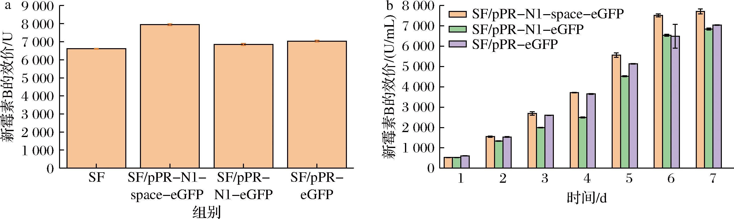 通过将上述获得的3株工程菌株进行摇瓶发酵并测定新霉素的产量发现,相对于出发菌株SF-2,3株工程菌经摇瓶发酵7 d之后,测定的新霉素产量达到了7 943、6 849、7 029 U/mL,相对于SF-2分别提高了20%、3.5%和6.3%。如图6所示,相对于SF/pPR-N1-space-eGFP,SF/pPR-N1-eGFP、SF/pPR-eGFP对于新霉素B发酵效价没有明显提升。这部分结果说明,核糖开关N1对费氏链霉菌新霉素的发酵调控可能发挥着重要的作用,且通过2组实验证明,带有启动子元件ermE#的工程菌SF/pPR-N1-space-eGFP与新霉素B的响应灵敏度和特异性更强,符合设计实验的初衷。
