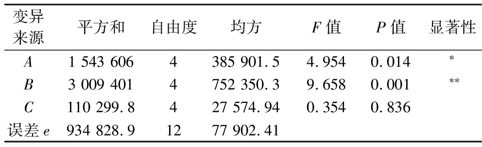 变异来源平方和自由度均方F值P值显著性A1 543 6064385 901.54.9540.014∗B3 009 4014752 350.39.6580.001∗∗C110 299.8427 574.940.3540.836误差e934 828.91277 902.41