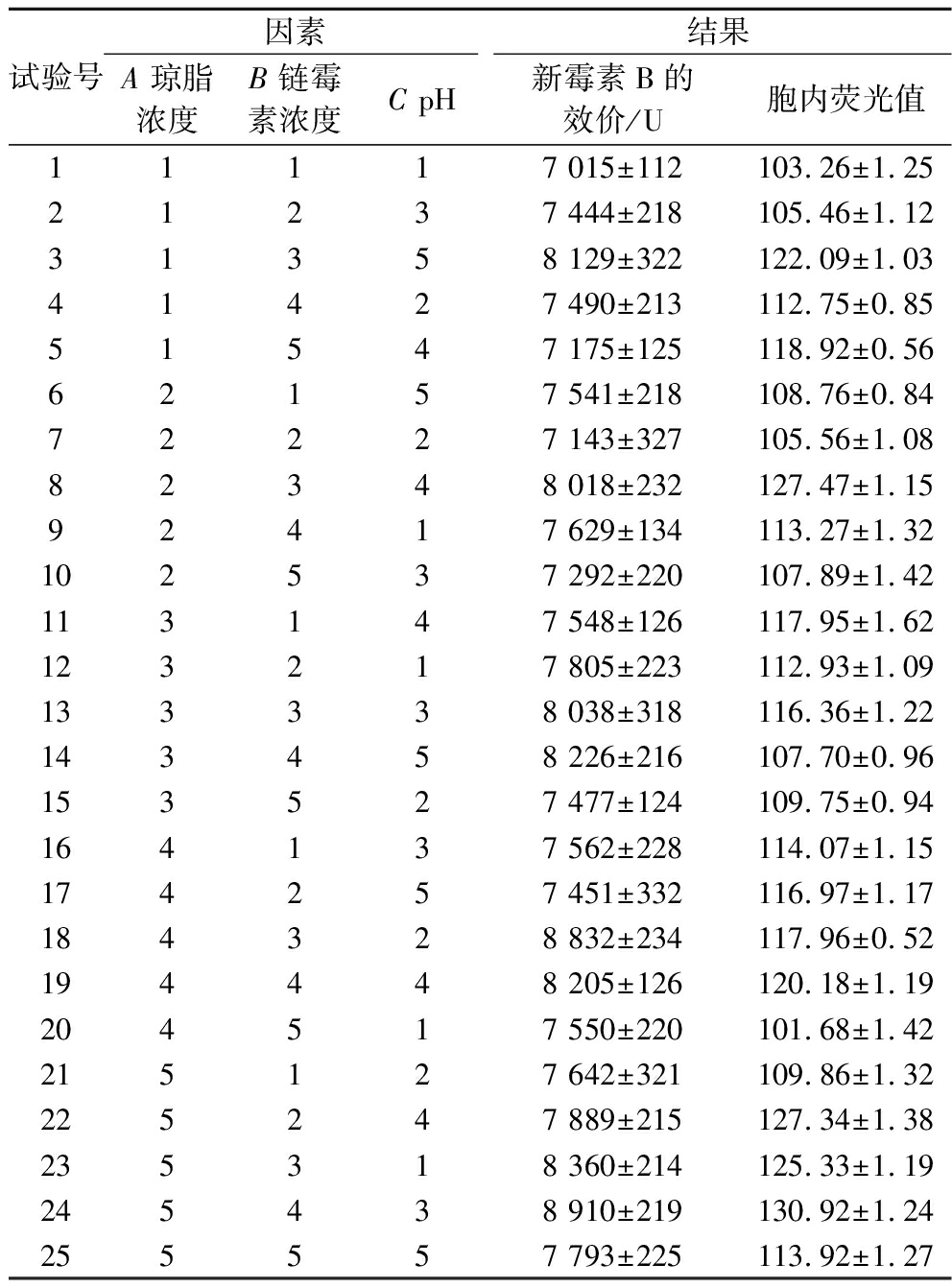 在数学学科的相关理论中,正交法主要是在数理统计、概率论和线性代数为基础的前提下,选用标准的正交化作为试验设计原理而进行相关的设计试验,选取对新霉素B的效价具有影响的3个因素琼脂浓度,链霉素浓度和pH。每个因素确定5个水平,利用L25(56)正交试验,以新霉素B的效价、胞内荧光值为考察指标,确定最佳工艺,正交试验因素与水平设计见表6。