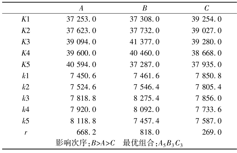 ABCK1562.480 553.900 556.470 K2562.950 568.260 555.880 K3564.690 609.210 574.700 K4570.860 584.820 611.860 K5607.370 552.160 569.440 k1112.496 110.780 111.294 k2112.590 113.652 111.176 k3112.938 121.842 114.940 k4114.172 116.964 122.372 k5121.474 110.432 113.888 r8.978 11.410 11.196 影响次序:B>C> A 最优组合:A5B3C4