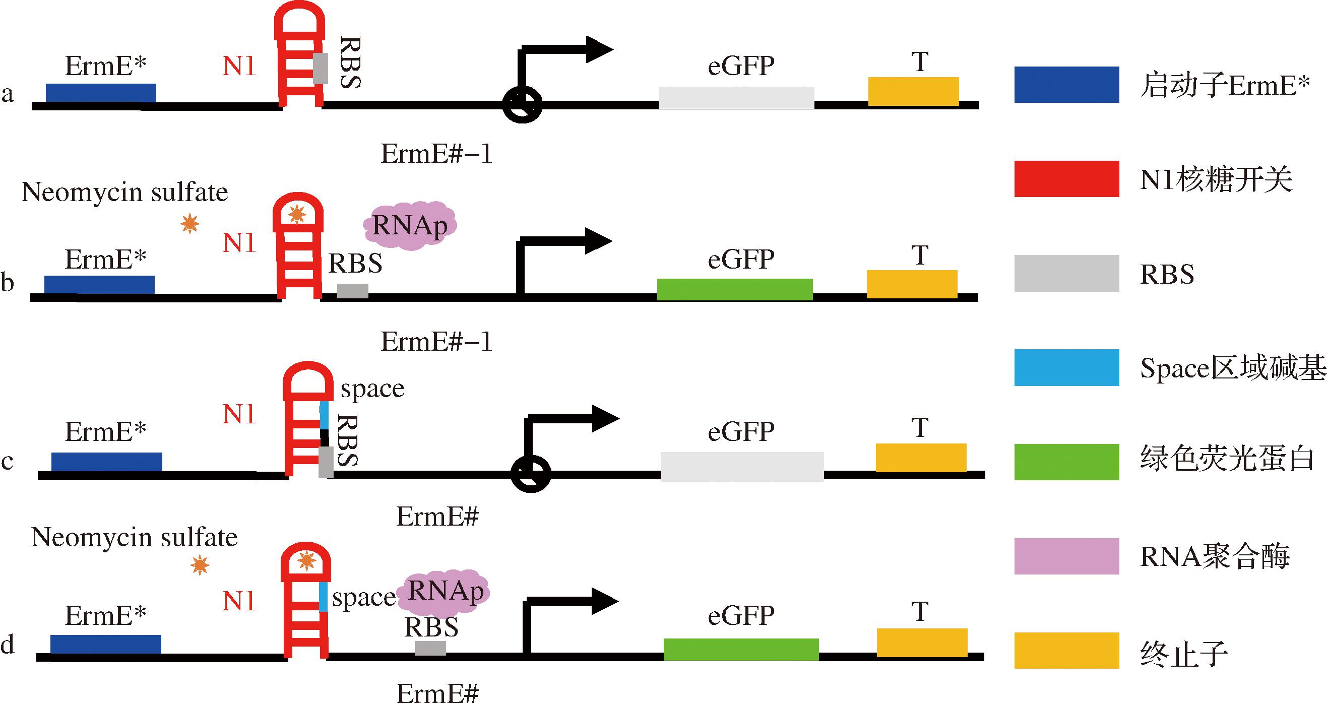目前微生物传感器主要有转录因子依赖型和核糖开关依赖型。费氏链霉菌内源和外源的转录因子能够特异性响应新霉素的报道不常见,而研究者在大肠杆菌中较为透彻地研究了能够特异性响应新霉素B的核糖开关N1[17-18]。因此,我们基于N1和基因线路原理尝试构建能够响应新霉素B[19-20]的生物传感器,为新霉素B高产菌株费氏链霉菌的高通量筛选提供技术方法。
