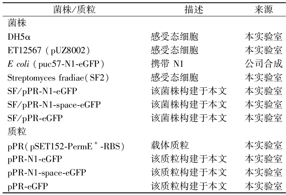 菌株/质粒描述来源菌株DH5α感受态细胞本实验室ET12567 (pUZ8002)感受态细胞本实验室E coli (puc57-N1-eGFP)携带 N1公司合成Streptomyces fradiae(SF2)感受态细胞本实验室SF/pPR-N1-eGFP该菌株构建于本文本实验室SF/pPR-N1-space-eGFP该菌株构建于本文本实验室SF/pPR-eGFP该菌株构建于本文本实验室质粒pPR(pSET152-PermE∗-RBS)载体质粒本实验室pPR-N1-eGFP该质粒构建于本文本实验室pPR-N1-space-eGFP该质粒构建于本文本实验室pPR-eGFP该质粒构建于本文本实验室
