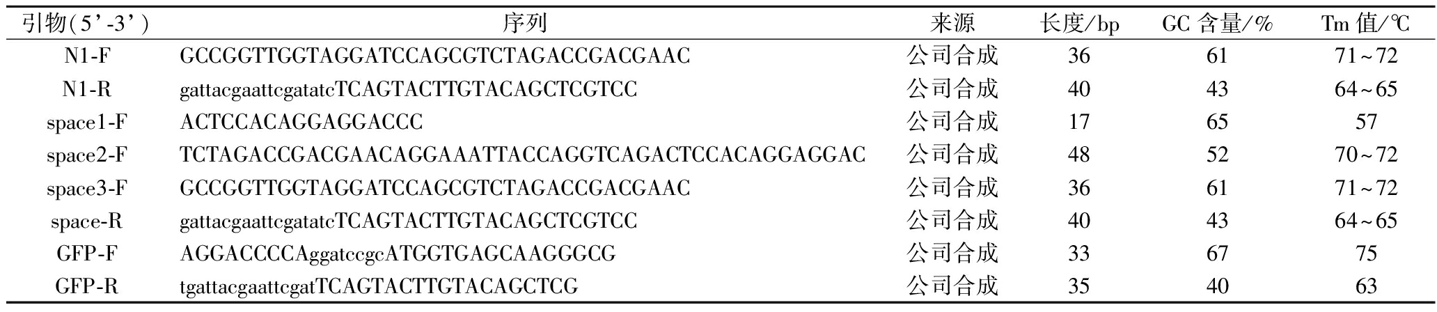 引物(5’-3’)序列来源长度/bpGC含量/%Tm值/℃N1-FGCCGGTTGGTAGGATCCAGCGTCTAGACCGACGAAC公司合成366171~72N1-RgattacgaattcgatatcTCAGTACTTGTACAGCTCGTCC公司合成404364~65space1-FACTCCACAGGAGGACCC公司合成176557space2-FTCTAGACCGACGAACAGGAAATTACCAGGTCAGACTCCACAGGAGGAC公司合成485270~72space3-FGCCGGTTGGTAGGATCCAGCGTCTAGACCGACGAAC公司合成366171~72space-RgattacgaattcgatatcTCAGTACTTGTACAGCTCGTCC公司合成404364~65GFP-FAGGACCCCAggatccgcATGGTGAGCAAGGGCG公司合成336775GFP-RtgattacgaattcgatTCAGTACTTGTACAGCTCG公司合成354063