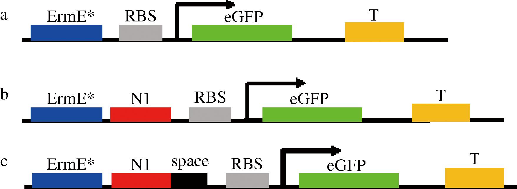 首先根据1.2.1节所述方法,分别构建重组质粒 pPR-N1-eGFP、pPR-N1-space-eGFP和pPR-eGFP,并通过化学转化至接合转移供体菌株E.coli ET12567中。在初始构建的菌株中,由于未引入14 bp非编码间隔序列,核糖开关N1的茎环结构与RBS区域空间距离过近。当新霉素B诱导发夹结构展开时,RNA聚合酶的庞大体积与残留茎环结构产生空间位阻,导致RBS结合位点被部分遮蔽,造成核糖体识别效率下降,降低基因线路的灵敏度与特异性。通过引入特定设计的间隔序列延长核糖开关N1下游结构域,使RBS位点完全暴露于转录复合物作用范围,该优化策略成功提升了核糖体结合效率,使生物传感器的信号响应幅度实现显著增强。核糖开关启动子元件如图3所示。将转化后的菌落接入含安普霉素抗性的LB液体培养基过夜培养然后提取质粒测序,测序结果与实验预测结果对比二者完全一致,表明3个重组质粒构建成功。