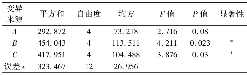 变异来源平方和自由度均方F值P值显著性A292.872473.2182.7160.08B454.0434113.5114.2110.023∗C417.9514104.4883.8760.03∗误差e323.4671226.956