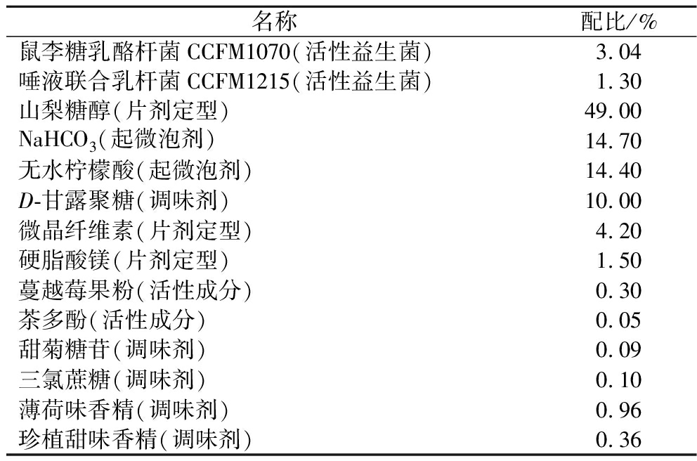 名称配比/%鼠李糖乳酪杆菌CCFM1070(活性益生菌)3.04唾液联合乳杆菌CCFM1215(活性益生菌)1.30山梨糖醇(片剂定型)49.00NaHCO3(起微泡剂)14.70无水柠檬酸(起微泡剂)14.40D-甘露聚糖(调味剂)10.00微晶纤维素(片剂定型)4.20硬脂酸镁(片剂定型)1.50蔓越莓果粉(活性成分)0.30茶多酚(活性成分)0.05甜菊糖苷(调味剂)0.09三氯蔗糖(调味剂)0.10薄荷味香精(调味剂)0.96珍植甜味香精(调味剂)0.36