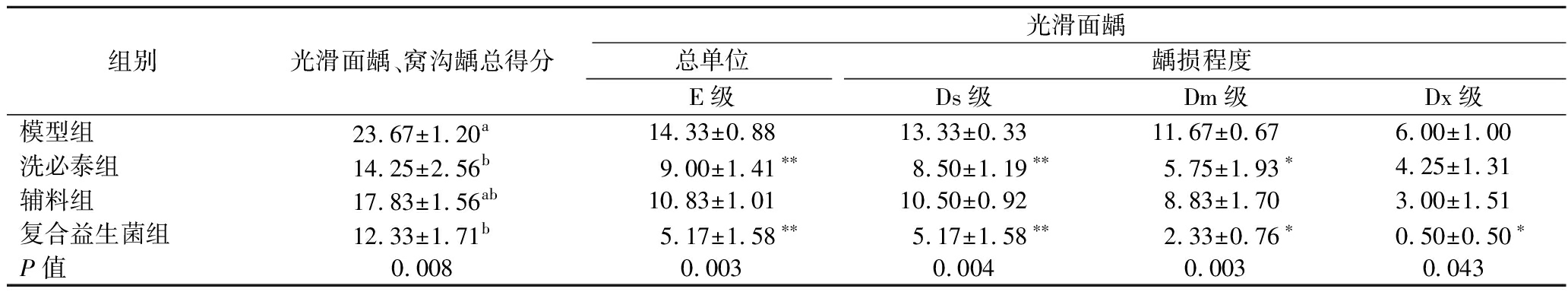 组别光滑面龋、窝沟龋总得分光滑面龋总单位龋损程度E级Ds级Dm级Dx级模型组23.67±1.20a14.33±0.8813.33±0.3311.67±0.676.00±1.00洗必泰组14.25±2.56b9.00±1.41∗∗8.50±1.19∗∗5.75±1.93∗4.25±1.31辅料组17.83±1.56ab10.83±1.0110.50±0.928.83±1.703.00±1.51复合益生菌组12.33±1.71b5.17±1.58∗∗5.17±1.58∗∗2.33±0.76∗0.50±0.50∗P值0.0080.0030.0040.0030.043