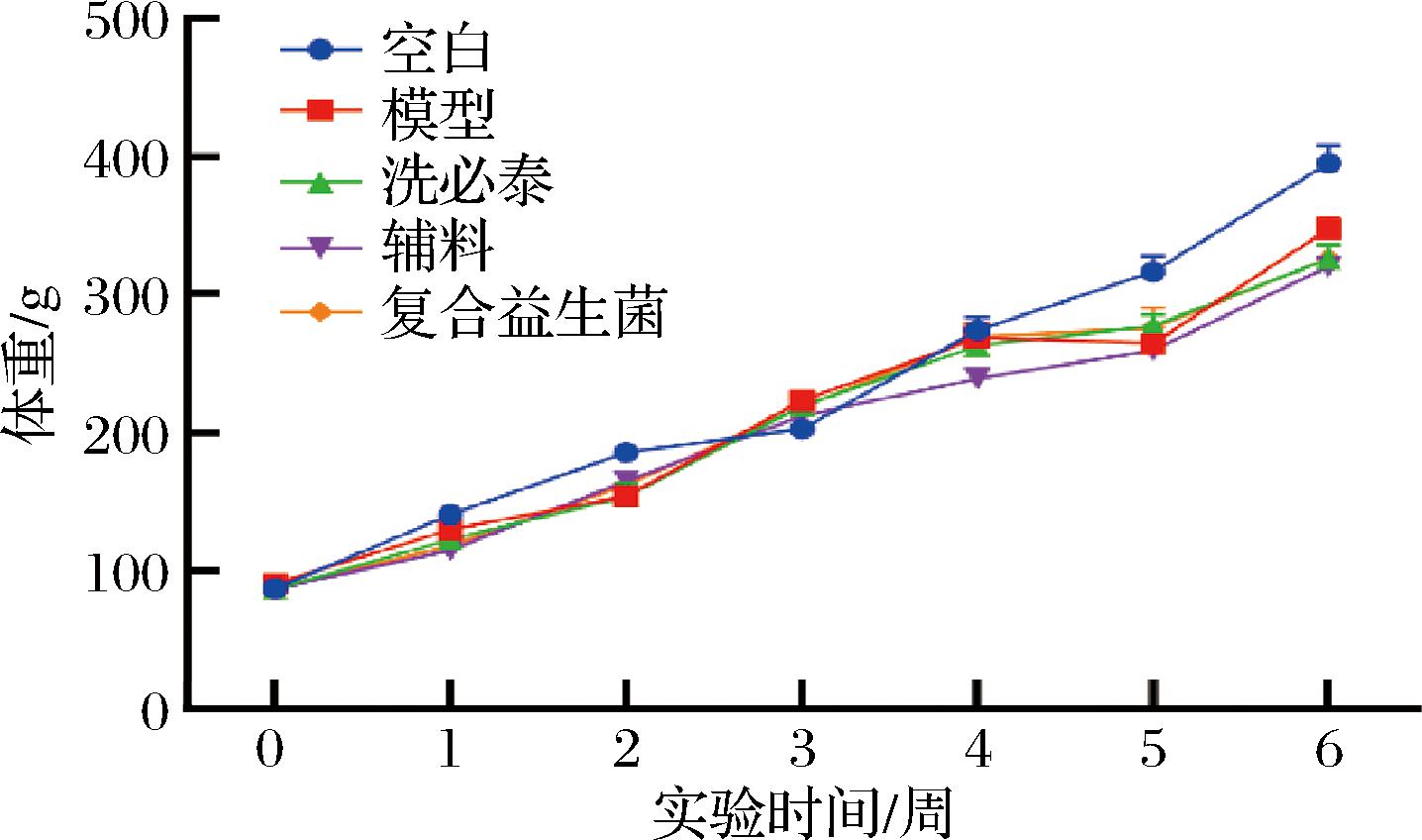 如图2所示,整个实验期间各组大鼠体重稳步增长,模型组与各干预组大鼠体重增长量均无统计学差异,说明益生菌干预不会影响大鼠体重。