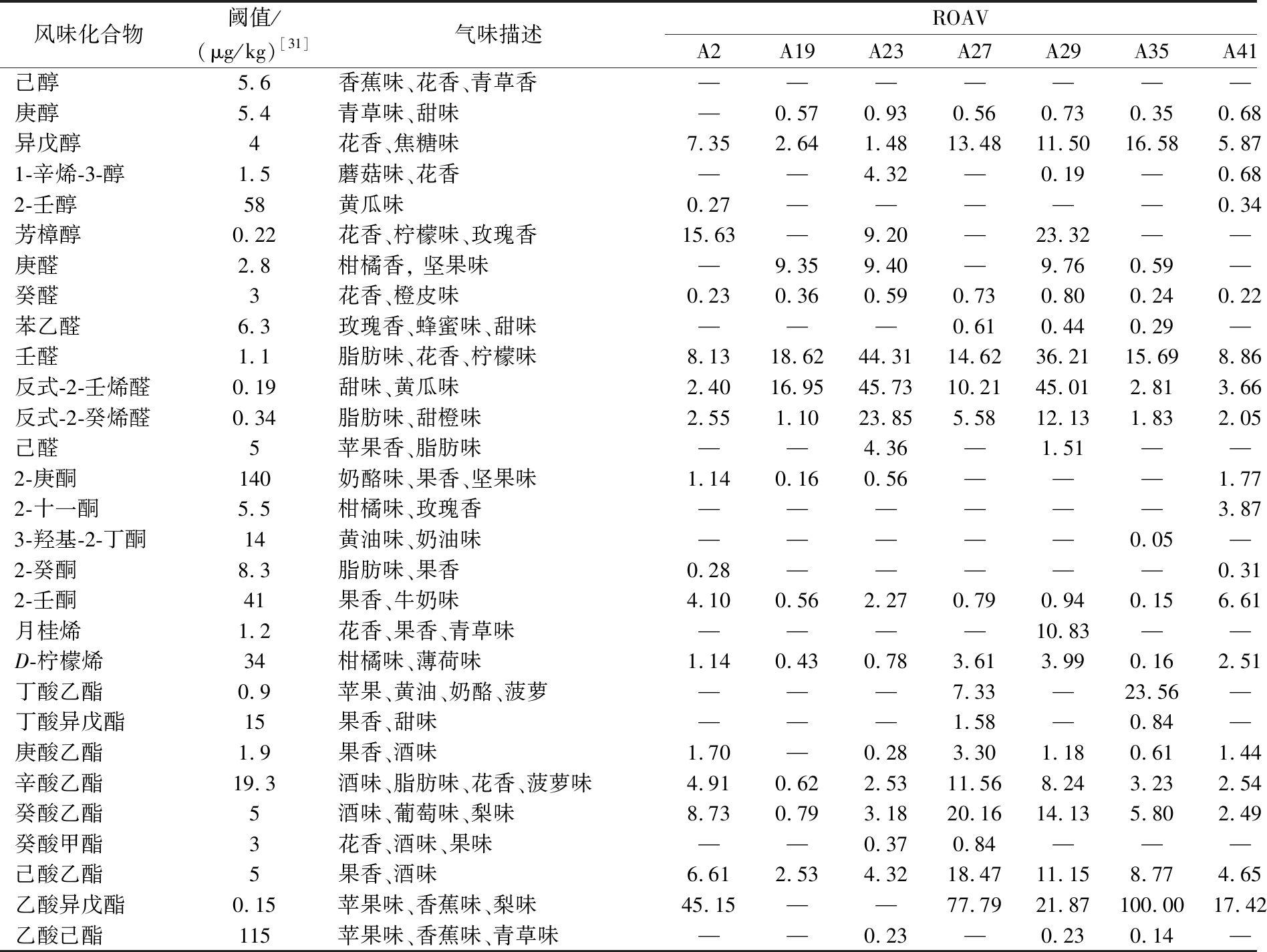 风味化合物阈值/(μg/kg)[31]气味描述ROAVA2A19A23A27A29A35A41A42己醇5.6香蕉味、花香、青草香———————1.05庚醇5.4青草味、甜味—0.570.930.560.730.350.680.46异戊醇4花香、焦糖味7.352.641.4813.4811.5016.585.87—1-辛烯-3-醇1.5蘑菇味、花香——4.32—0.19—0.680.442-壬醇58黄瓜味0.27—————0.34—芳樟醇0.22花香、柠檬味、玫瑰香15.63—9.20—23.32——19.61庚醛2.8柑橘香, 坚果味—9.359.40—9.760.59—9.13癸醛3花香、橙皮味0.230.360.590.730.800.240.220.71苯乙醛6.3玫瑰香、蜂蜜味、甜味———0.610.440.29——壬醛1.1脂肪味、花香、柠檬味8.1318.6244.3114.6236.2115.698.8624.19反式-2-壬烯醛0.19甜味、黄瓜味2.4016.9545.7310.2145.012.813.667.84反式-2-癸烯醛0.34脂肪味、甜橙味2.551.1023.855.5812.131.832.053.28己醛5苹果香、脂肪味——4.36—1.51——1.672-庚酮140奶酪味、果香、坚果味1.140.160.56———1.77—2-十一酮5.5柑橘味、玫瑰香——————3.87—3-羟基-2-丁酮14黄油味、奶油味—————0.05—0.462-癸酮8.3脂肪味、果香0.28—————0.31—2-壬酮41果香、牛奶味4.100.562.270.790.940.156.610.29月桂烯1.2花香、果香、青草味————10.83——9.59D-柠檬烯34柑橘味、薄荷味1.140.430.783.613.990.162.511.70丁酸乙酯0.9苹果、黄油、奶酪、菠萝———7.33—23.56——丁酸异戊酯15果香、甜味———1.58—0.84——庚酸乙酯1.9果香、酒味1.70—0.283.301.180.611.44—辛酸乙酯19.3酒味、脂肪味、花香、菠萝味4.910.622.5311.568.243.232.540.11癸酸乙酯5酒味、葡萄味、梨味8.730.793.1820.1614.135.802.490.05癸酸甲酯3花香、酒味、果味——0.370.84————己酸乙酯5果香、酒味6.612.534.3218.4711.158.774.65—乙酸异戊酯0.15苹果味、香蕉味、梨味45.15——77.7921.87100.0017.42—乙酸己酯115苹果味、香蕉味、青草味——0.23—0.230.14——