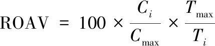 式中:Ci,化合物i的相对含量,μg/kg;Cmax,最高气味活性值(odor activity value,OAV)化合物的相对含量,μg/kg;Tmax/Ti,化合物i与最高OAV化合物的阈值比值。