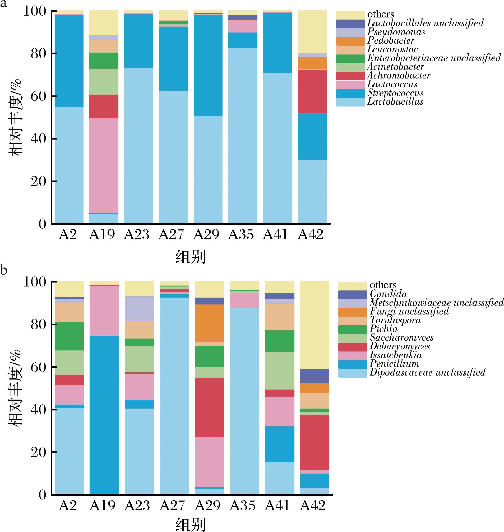 基于Bray-Curtis距离矩阵的主坐标分析(principal co-ordinates analysis,PCoA)结果表明(图2),不同样本间微生物群落的Beta多样性呈现显著的空间分异特征。如图2-a所示,在细菌群落中,样品A2、A23、A27、A29、A41在第一、四象限形成显著的空间聚类,表明这些样本间具有较高的细菌群落相似性。值得注意的是,样品A19和A42分别独立分布于第三和第二象限,空间分离特征显著(P<0.05),提示这2组样品的细菌群落组成存在显著差异。如图2-b所示,真菌群落的PCoA结果显示,各样本呈现相对离散的分布模式,反映出样品间真菌群落结构的异质性。具体而言,样品A27与A35具有较近的空间距离,表明其真菌群落组成具有一定相似性。值得关注的是,样品A19在细菌和真菌群落中均表现出显著的空间分离特征,表明该样品微生物群落组成特异。综上所述,除样品A19和A42外,不同组奶酪样品的细菌群落结构呈现显著的空间聚集特征,而真菌群落则表现出更高的差异性。