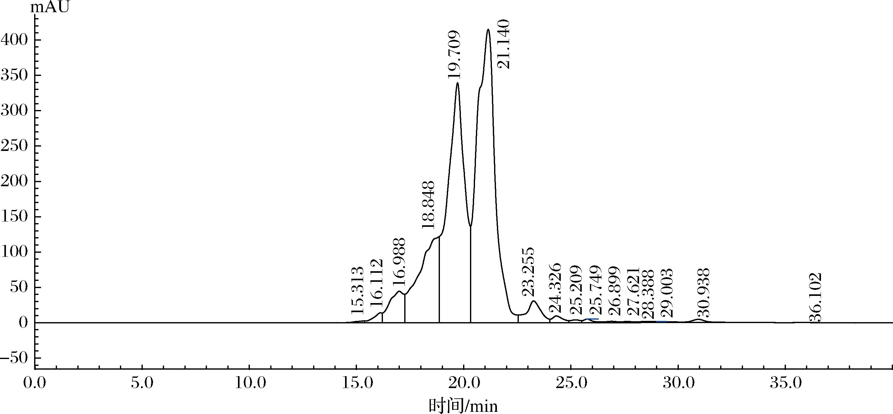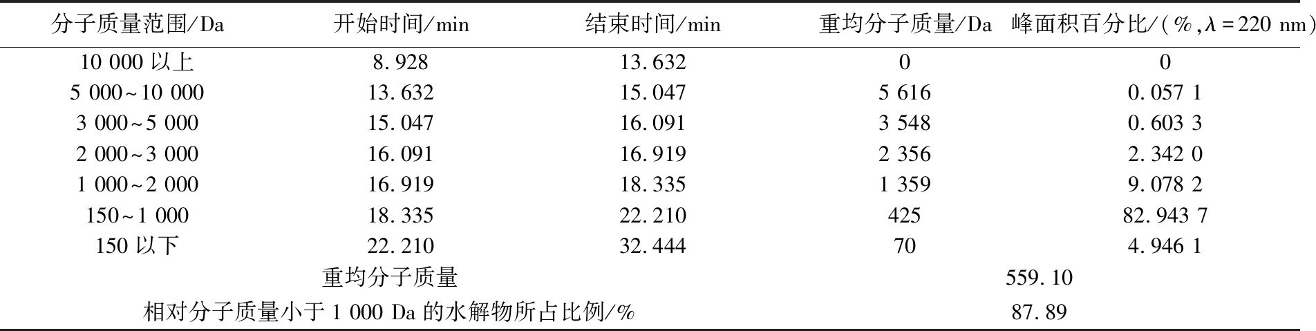 分子质量范围/Da开始时间/min结束时间/min重均分子质量/Da峰面积百分比/(%,λ=220 nm)10 000以上8.92813.632005 000^10 00013.63215.0475 6160.057 13 000^5 00015.04716.0913 5480.603 32 000^3 00016.09116.9192 3562.342 01 000^2 00016.91918.3351 3599.078 2150^1 00018.33522.21042582.943 7150以下22.21032.444704.946 1重均分子质量559.10相对分子质量小于1 000 Da的水解物所占比例/%87.89