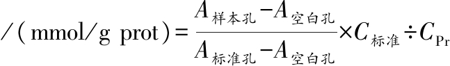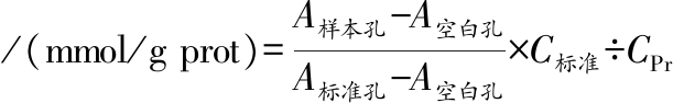 式中:A样本孔,样本在500 nm处的吸光度值;A标准孔,标准品在500 nm处的吸光度值;A空白孔,溶剂在500 nm处的吸光度值;C标准=2.39 mmol/L;Cpr,待测样本蛋白浓度,g prot/L。