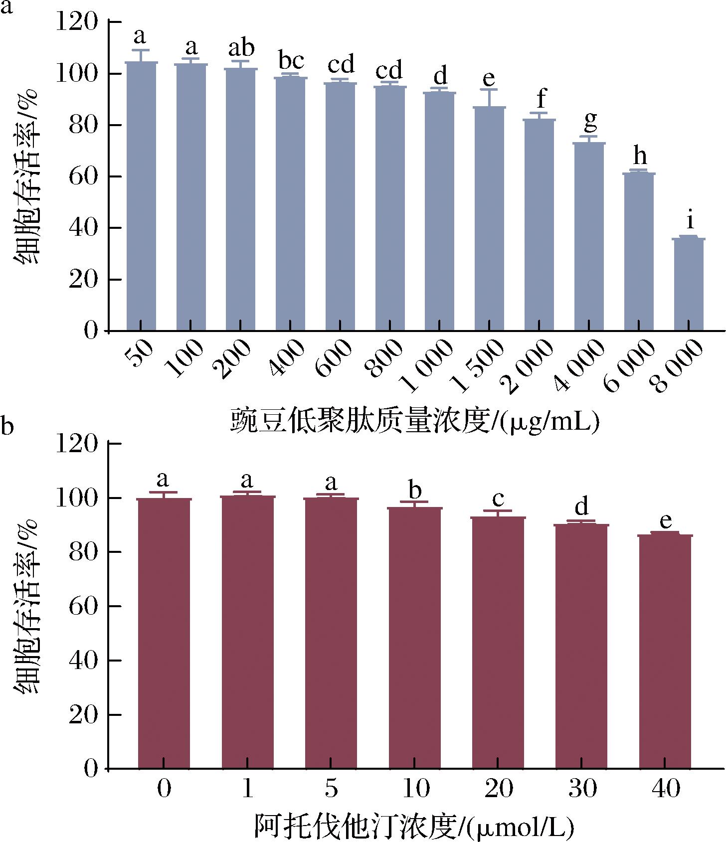 a-豌豆低聚肽质量浓度对细胞存活率的影响;b-阿托伐他汀浓度对细胞存活率的影响