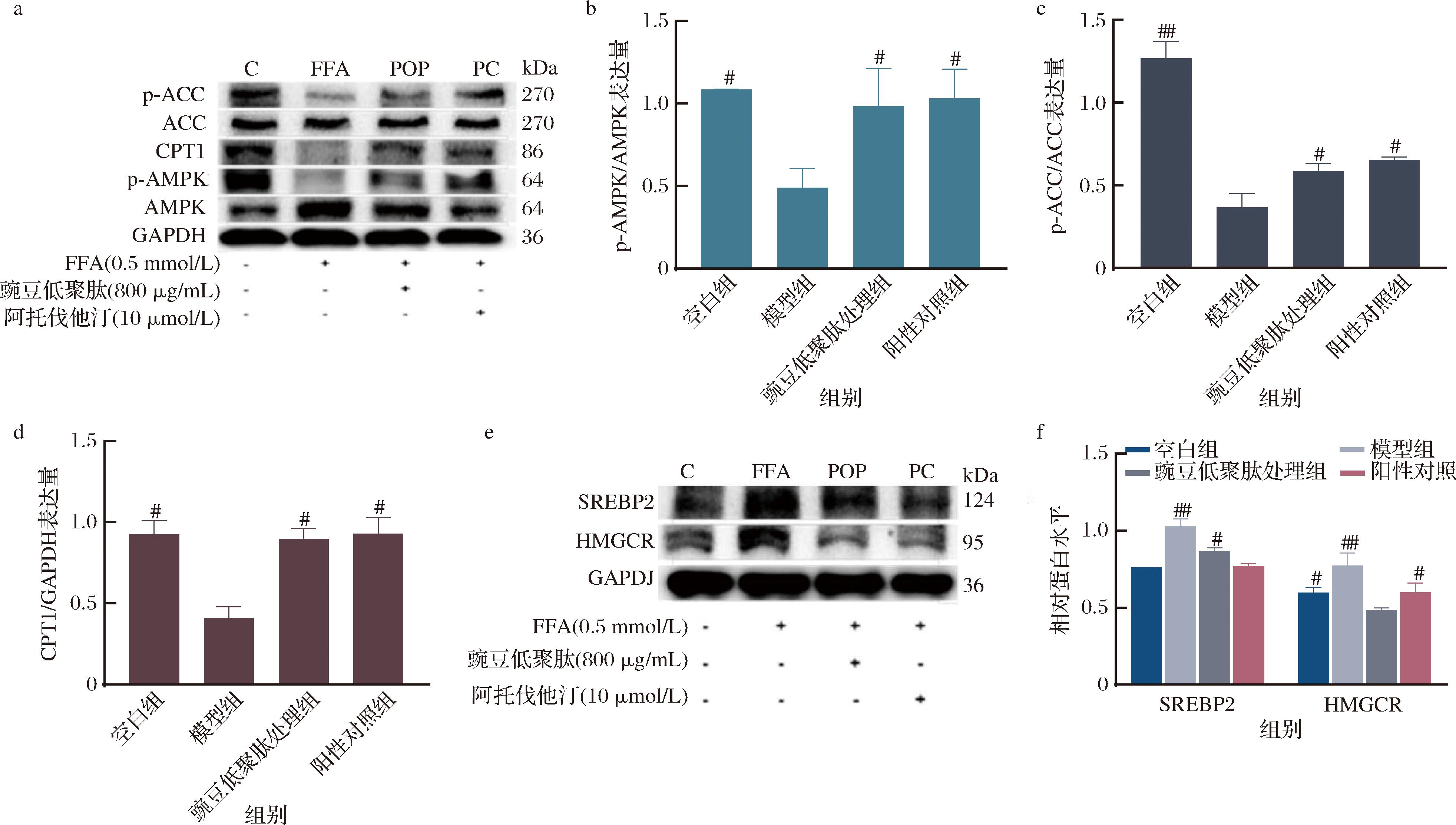 取对数生长期的细胞接种至6孔细胞培养板(1×106个/孔),每孔加2 mL细胞悬液,培养24 h后丢弃完全培养基并用PBS润洗,设置4个实验组,分别为空白组(含1%BSA的DMEM)、游离脂肪酸组(0.5 mmol/L FFA)、豌豆低聚肽组(0.5 mmol/L FFA+800 μg/mL豌豆低聚肽)和阿托伐他汀组(0.5 mmol/L FFA+10 μmol/L阿托伐他汀),培养24 h。培养后缓慢吸去细胞培养液并润洗,加入已混合苯甲基磺酰氟(phenyl methane sulfonyl fluoride, PMSF)、蛋白酶抑制剂和磷酸酶抑制剂的200 μL细胞裂解液吹打混匀裂解,裂解液离心3~5 min(10 000~14 000 r/min),取上清液。每个实验组蛋白浓度检测同1.3.4.4节。用裂解液、蛋白溶液稀释样品,使得每个样品的蛋白质量浓度最终为4 μg/μL,置于沸水浴中煮沸5 min,再分装并于-80 ℃保存。