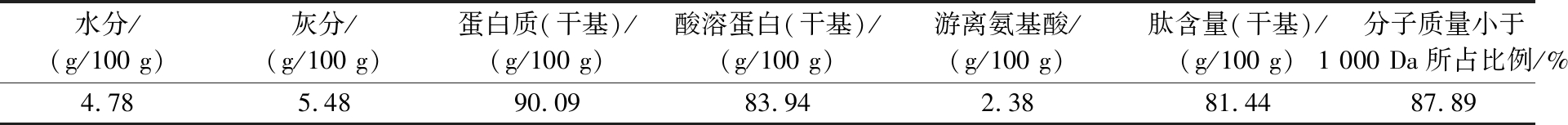 水分/(g/100 g)灰分/(g/100 g)蛋白质(干基)/(g/100 g)酸溶蛋白(干基)/(g/100 g)游离氨基酸/(g/100 g)肽含量(干基)/(g/100 g)分子质量小于1 000 Da所占比例/%4.785.4890.0983.942.3881.4487.89