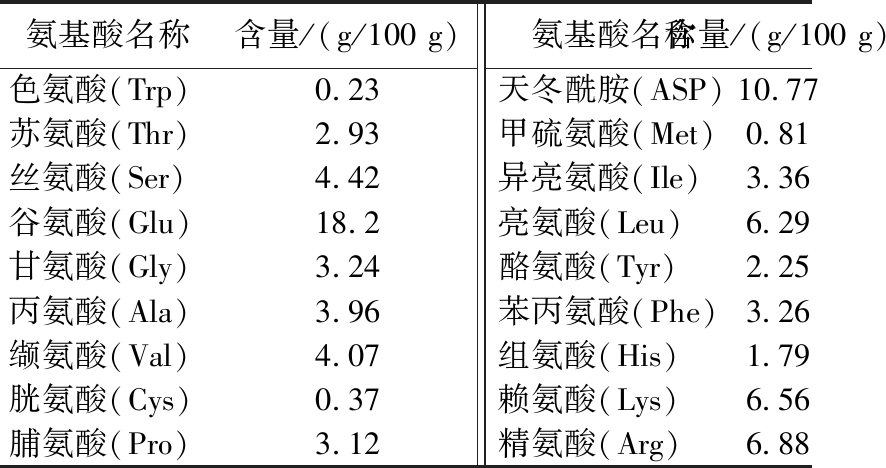 氨基酸名称含量/(g/100 g)氨基酸名称含量/(g/100 g)色氨酸(Trp)0.23天冬酰胺(ASP)10.77苏氨酸(Thr)2.93甲硫氨酸(Met)0.81丝氨酸(Ser)4.42异亮氨酸(Ile)3.36谷氨酸(Glu)18.2亮氨酸(Leu)6.29甘氨酸(Gly)3.24酪氨酸(Tyr)2.25丙氨酸(Ala)3.96苯丙氨酸(Phe)3.26缬氨酸(Val)4.07组氨酸(His)1.79胱氨酸(Cys)0.37赖氨酸(Lys)6.56脯氨酸(Pro)3.12精氨酸(Arg)6.88