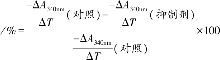 HMG-CoA还原酶(EC 1.1.1.34)是甲羟戊酸途径的速率控制酶,甲羟戊酸途径是从乙酰-CoA产生胆固醇的代谢途径[10]。在NADPH的反应中,HMG-CoA还原酶将HMG-CoA还原生成甲羟戊酸盐和CoA,这种酶是他汀类降胆固醇药物的靶点。抑制HMG-CoA还原酶诱导肝脏中低密度脂蛋白(low-density lipoprotein, LDL)受体的表达,能够降低血浆中胆固醇的浓度。使用HMG-CoA还原酶抑制活性测定试剂盒可以通过吸光度降低(OD340nm值)来测量NADPH的利用率。使用公式(1)计算抑制率:
