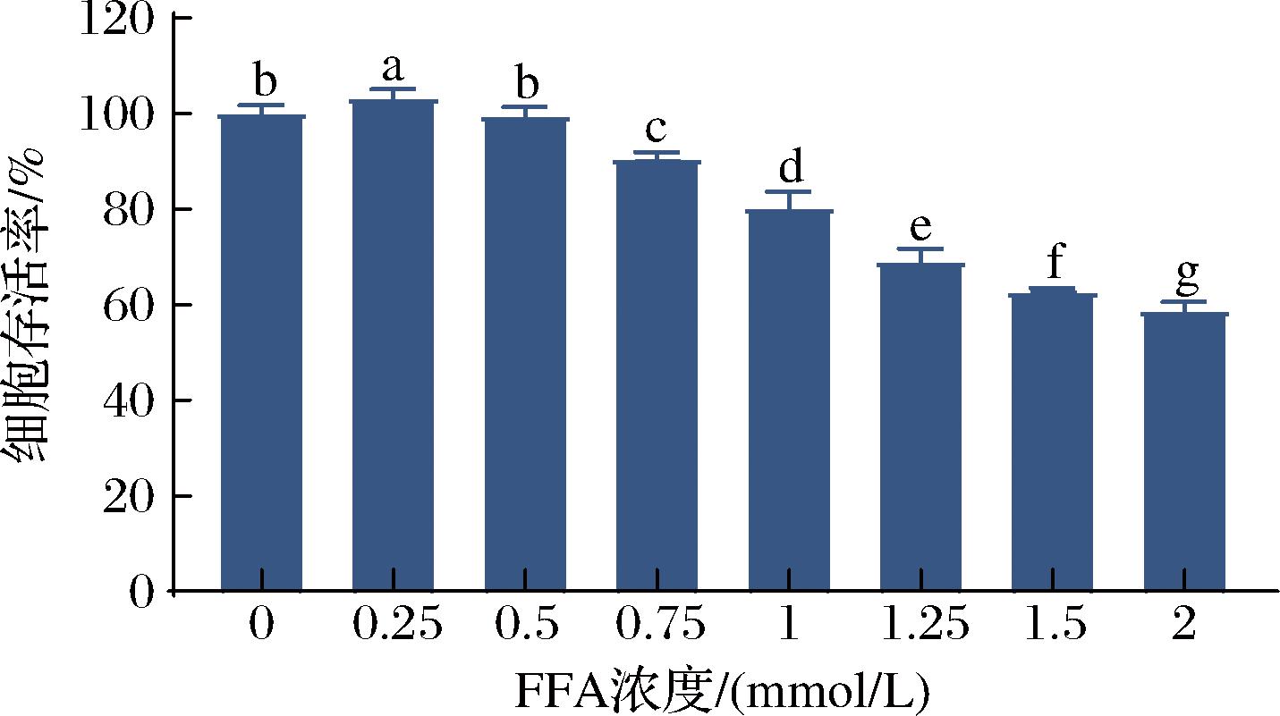 相关研究已经证明FFA可用于诱导HepG2细胞内脂质沉积,在一定浓度范围内,FFA诱导HepG2细胞内脂质积累和脂毒性呈剂量依赖性,FFA已被广泛用于诱导HepG2细胞建立NAFLD细胞模型[19]。本研究将HepG2细胞与不同浓度的FFA(油酸∶棕榈酸=2∶1,物质的量浓度比)混合培养24 h,观察游离脂肪酸对肝细胞体外活力的影响,CCK8法检测FFA对HepG2细胞毒性。如图4所示,与对照组相比,随着FFA浓度的增加,细胞存活率呈现明显的浓度依赖性下降趋势,尤其是FFA浓度大于1 mmol/L时,细胞存活率显著下降,这与MA等[20]和JIN等[21]利用FFA诱导HepG2细胞建立NAFLD细胞模型研究中的结果相似,0.5 mmol/L FFA不影响HepG2细胞存活率,因此,选择0.5 mmol/L FFA来诱导HepG2细胞建立NAFLD细胞模型。