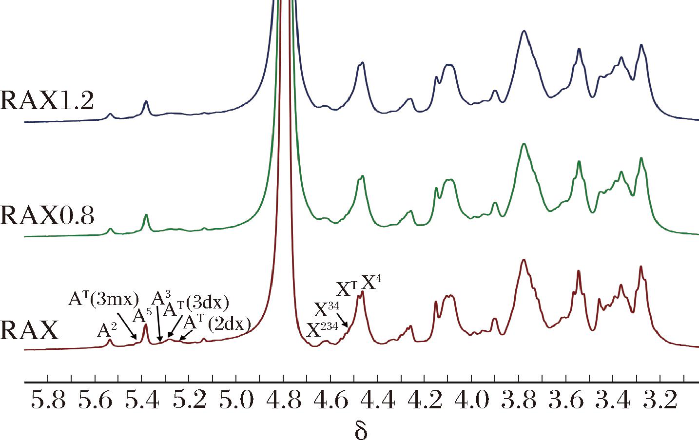 此外,RAX中糖残基的化学位移和含量如表4所示,RAX0.8的α-L-Araf含量为23.37%,显著低于RAX(27.06%),表明SE处理在较低压强(0.8 MPa)时RAX侧链α-L-Araf连接断裂。与RAX和RAX0.8相比,RAX1.2的β-D-Xylp含量(71.95%)降低,并且X4变化趋势与之相同,表明在较高压强(1.2 MPa)时,SE处理对于RAX主链β-D-Xylp(X4)连接的破坏更为剧烈。1H NMR的分析结果与单糖和甲基化的结果相符。