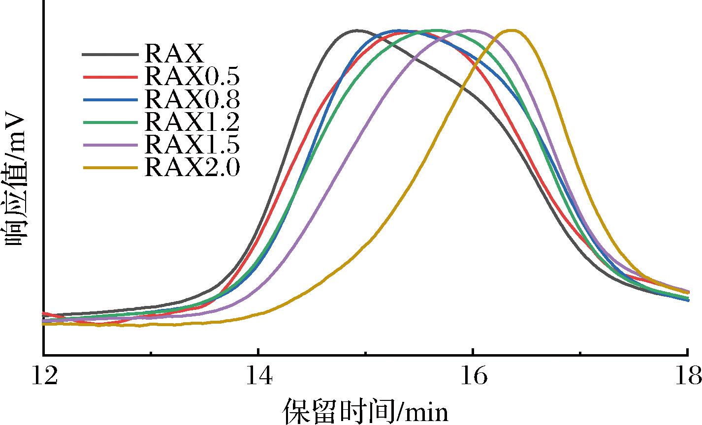 使用流动相(0.1 mol/L NaNO3溶液)作为溶剂,配制2 mg/mL的RAX溶液,60 ℃加热搅拌至完全溶解,利用HPSEC进行分子质量分布测定。色谱柱为Ultrahydrogel linear Column(7.8 mm×300 mm),检测温度为40 ℃,检测流速为0.6 mL/min。