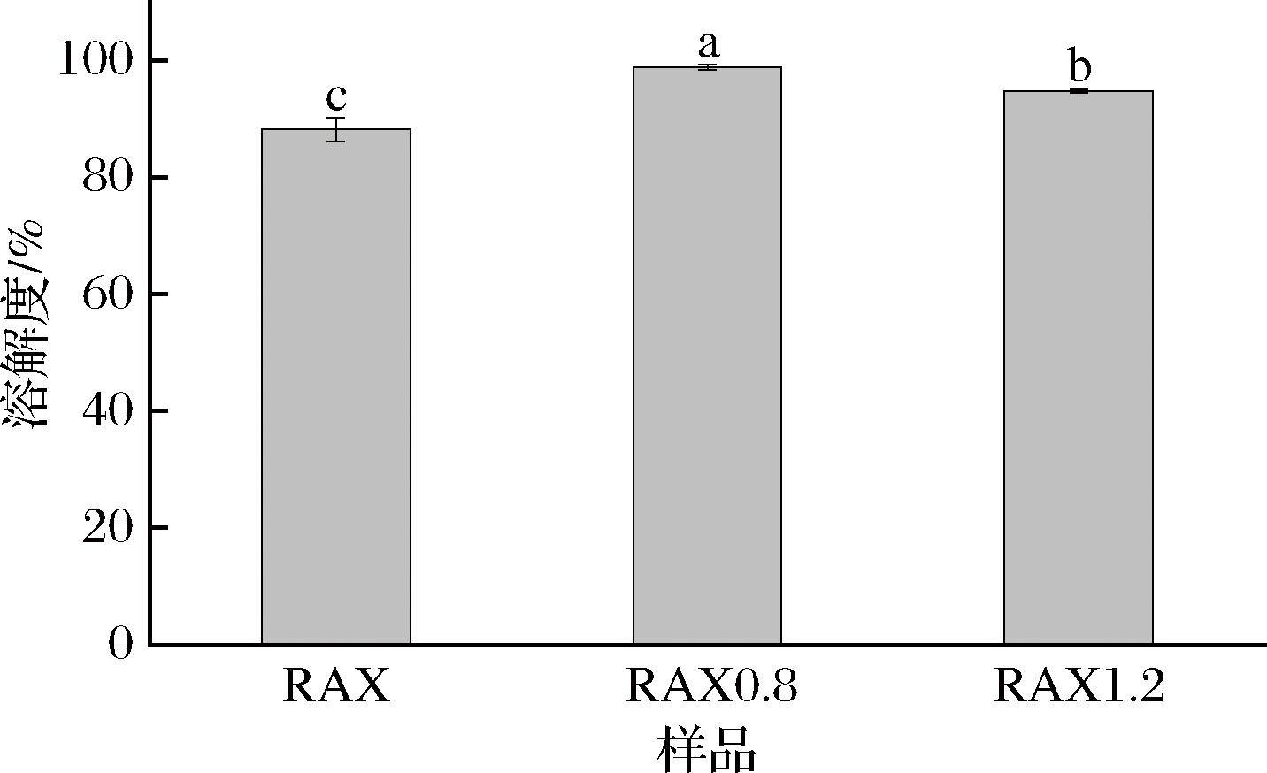 如图5所示,SE预处理能够显著增加RAX的溶解度(P<0.05)。一般来说,RAX的溶解度与分子质量和阿魏酸含量呈负相关,与阿拉伯糖/木糖值呈正相关[30]。这是因为,高分子质量RAX能通过交联或聚合反应,增加分子链缠结和空间位阻,降低在水中的分散能力;较高阿魏酸含量会导致RAX链与链之间形成共价“双阿魏酸桥”交联,使RAX在水溶液中溶解度较低;阿拉伯糖/木糖值降低导致木糖主链的β-1,4糖苷键排列更规整,分子间氢键增强,结晶度提高,溶解性下降[31]。RAX0.8溶解性的增加可能是SE处理使其分子质量降低和酚酸含量降低的正向作用远大于阿拉伯糖/木糖值降低的负向作用。同时,RAX1.2的溶解度较RAX0.8显著降低的原因归于其较低的阿拉伯糖/木糖值导致多糖分子间氢键数量增加。总之,SE处理可以作为改善RAX溶解性的一种有效技术。