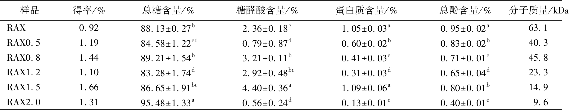 样品得率/%总糖含量/%糖醛酸含量/%蛋白质含量/%总酚含量/%分子质量/kDaRAX0.9288.13±0.27b2.36±0.18c1.05±0.03a0.95±0.02a63.1RAX0.51.1984.58±1.22cd0.79±0.87d0.60±0.02b0.83±0.02b40.3RAX0.81.4489.21±1.54b3.21±0.11b0.41±0.03c0.71±0.01c45.8RAX1.21.1083.28±1.74d2.92±0.48bc0.31±0.03d0.65±0.04d23.3RAX1.51.6686.65±1.91bc4.40±0.36a1.09±0.06a0.80±0.01b14.9RAX2.01.3195.48±1.33a0.56±0.24d0.13±0.01e0.40±0.01e9.6