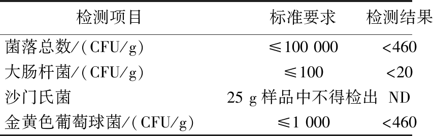 检测项目标准要求检测结果菌落总数/(CFU/g)≤100 000<460大肠杆菌/(CFU/g)≤100<20沙门氏菌25 g样品中不得检出ND金黄色葡萄球菌/(CFU/g)≤1 000<460