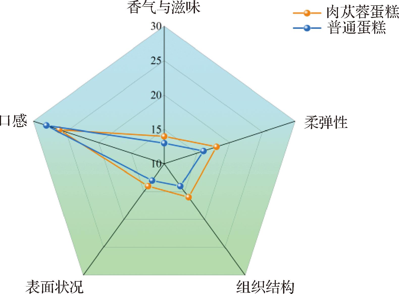 质构测试结果见表2。由表2可知,肉苁蓉蛋糕硬度为(66.13±1.8) g,与普通蛋糕硬度相接近。咀嚼性为(211.02±1.94) mJ,比普通蛋糕的升高约7.75%。内聚性为(0.92±0.05) mm,比普通蛋糕升高约0.58%。通过相关数据分析,肉苁蓉蛋糕整体表现出松软可口、富有弹性的特点,其在质地和口感上具有较高的品质。图2和表2的数据显示,肉苁蓉蛋糕在其口感方面相较于普通蛋糕略显不足,这可能与肉苁蓉粉本身含有较多纤维且其中酚类物质在烘烤过程中容易发生氧化反应,导致蛋糕硬度较高,颜色加深[18]。然而这些差异均在消费者可接受的范围内。综合感官评分来看,肉苁蓉蛋糕的整体评分略高于普通蛋糕,基本能够满足消费者的口味需求,具有较好的市场潜力和开发价值。