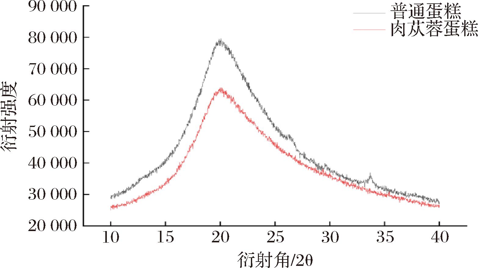 XRD可用于对淀粉中的晶体结构的研究,从而反映蛋糕在贮藏期的稳定性[31]。肉苁蓉粉的添加能够增加面团黏度,降低淀粉结晶度。淀粉结晶度会影响蛋糕的老化速度,淀粉结晶度越高,老化速度越快[32]。由图7可知,与肉苁蓉蛋糕的X-射线图谱相比,普通蛋糕在X-射线衍射角15.62°、20.72°、25.4°出现峰衍射峰,呈现出部分结晶度。结果表明在蛋糕中添加肉苁蓉粉后显著降低了X-射线衍射峰强度。