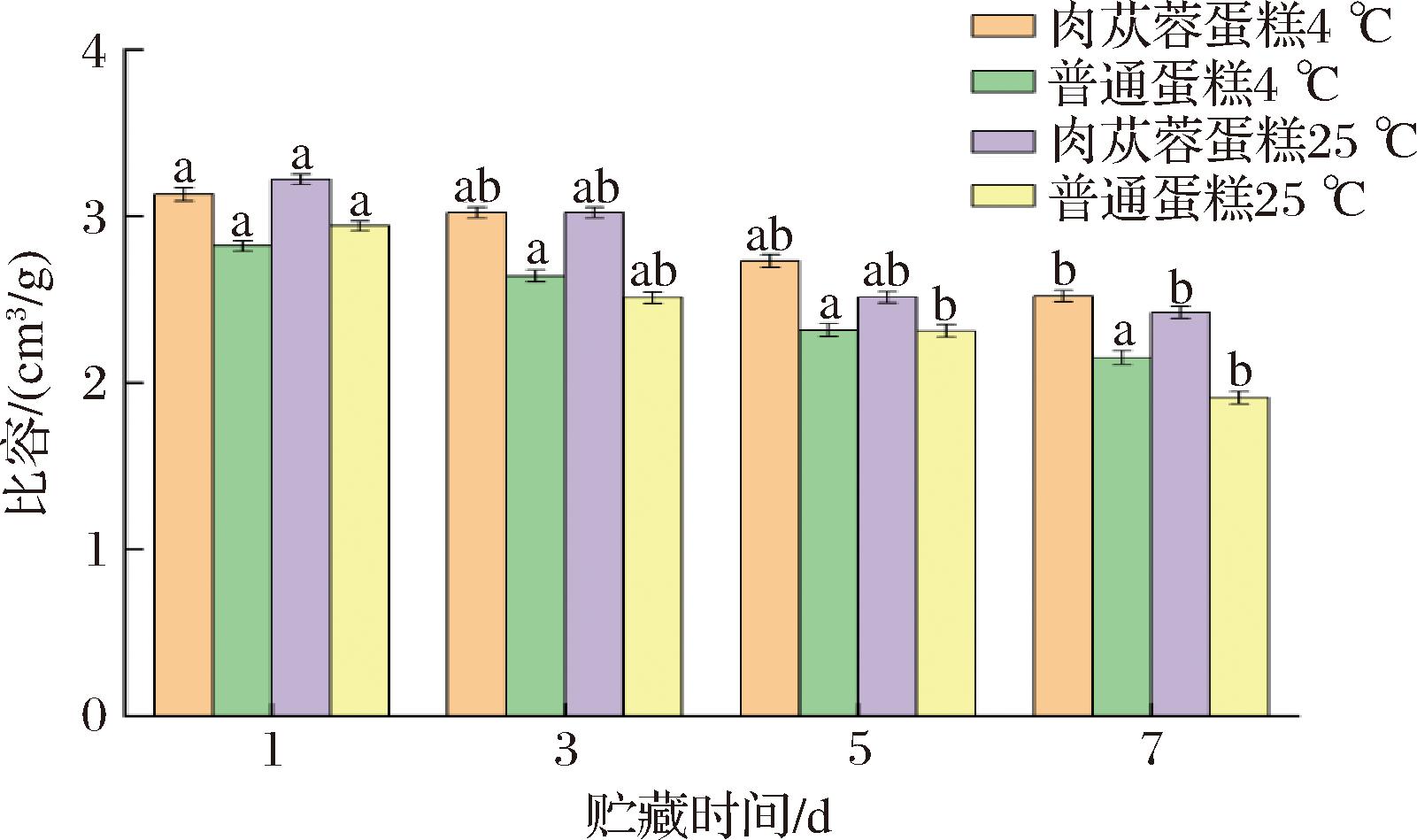 图4展示了肉苁蓉蛋糕和普通蛋糕在4 ℃和25 ℃ 2种不同温度条件下贮藏7 d期间的比容变化情况。数据显示,无论是在25 ℃还是4 ℃条件下,肉苁蓉蛋糕的比容下降速率都明显低于普通蛋糕。这表明肉苁蓉蛋糕在贮藏过程中具有更好的结构稳定性,能够更有效地保持其松软度和体积。肉苁蓉蛋糕在贮藏过程中表现出更优异的保水性和结构稳定性,这可能由于肉苁蓉中的纤维成分有助于保持蛋糕内部的水分,减缓水分流失的速度,从而在一定程度上延缓了蛋糕的老化过程。这一特性使得肉苁蓉蛋糕在较长的贮藏期内仍能保持较好的口感和品质,具有一定的保鲜优势[25],而肉苁蓉蛋糕比容下降速率较慢,说明肉苁蓉粉的添加具有一定的保水性,使蛋糕内部组织结构紧密稳定,这与上述扫描电镜结果一致。