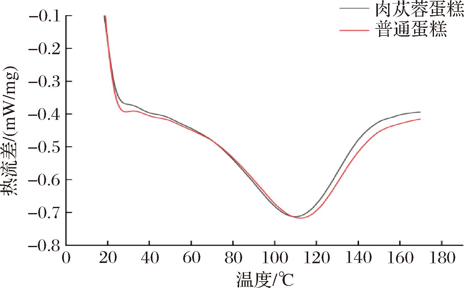 在本研究中,肉苁蓉蛋糕和普通蛋糕在4 ℃条件下贮藏7 d后,通过DSC分析发现,肉苁蓉蛋糕的焓值较普通蛋糕更低。这表明肉苁蓉粉的添加有助于抑制蛋糕在贮藏期间的淀粉老化现象[28]。表7中肉苁蓉蛋糕和普通蛋糕的T0分别为70.39 ℃和68.69 ℃,T分别为112.2 ℃和109.79 ℃。这些数据表明,肉苁蓉蛋糕的热变温度整体高于普通蛋糕,说明其淀粉结构在贮藏过程中表现出更好的稳定性。