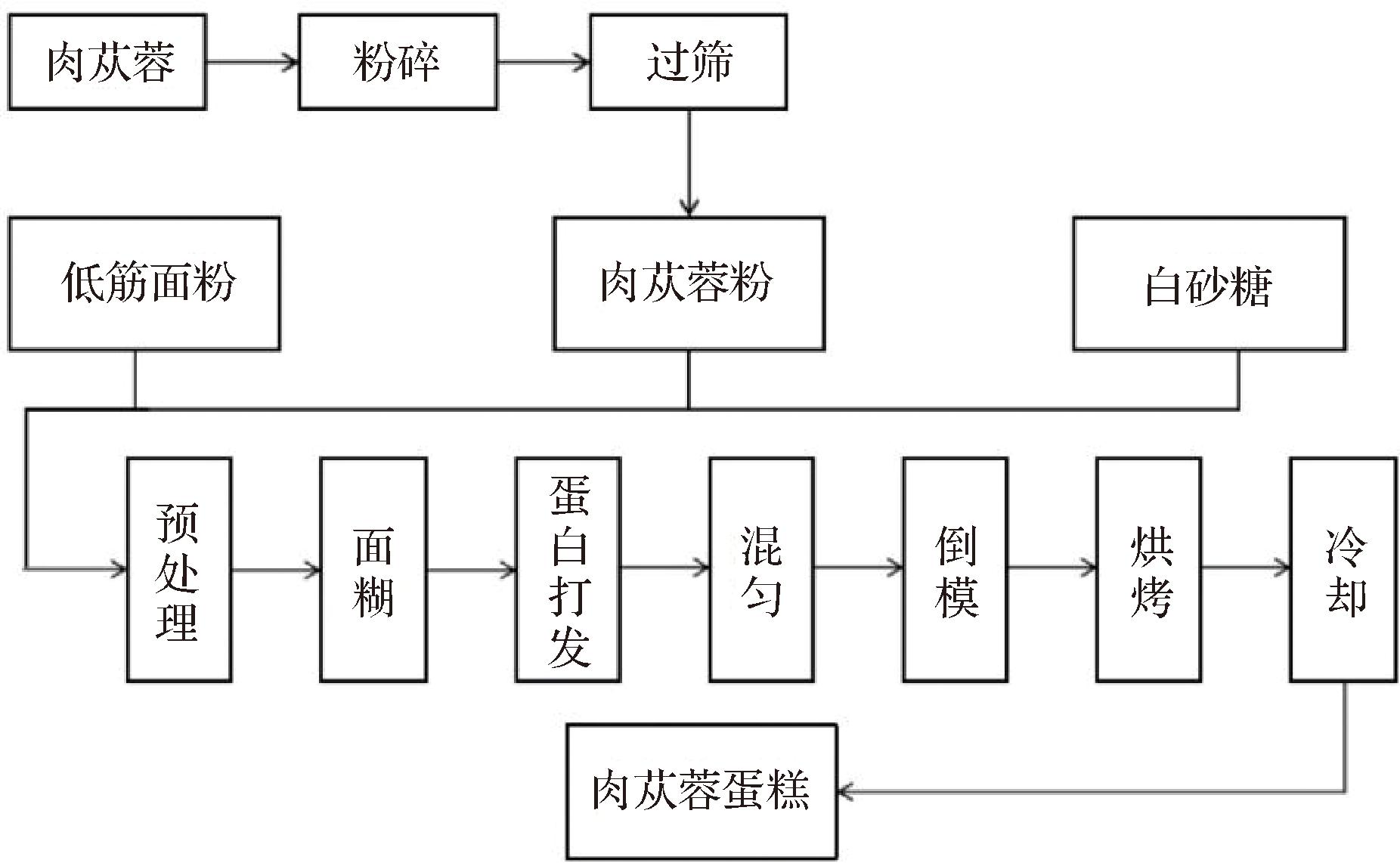 蛋糕作为一种备受瞩目的烘焙食品,凭借其细腻柔软的口感、诱人的色泽以及多样的造型,深受广大消费者的喜爱[4-5]。随着人们对健康食品的关注度不断提高,将具有独特保健功效的食材融入传统食品中成为了一种创新趋势。在传统蛋糕的制作过程中加入功能性原料,能够为蛋糕增添健康元素,同时改善其口感和结构。严康玲等[6]研制出的猴头菇戚风蛋糕采用食药同源的特点,制作出一款风味独特且营养价值较高的蛋糕,肉苁蓉作为一种珍贵的药食两用植物,含有丰富的营养成分和生物活性物质,具有补肾益精、润燥通便等多种功效,一直以来,肉苁蓉在医药领域被广泛加工和利用,主要用于药物材料,而很少被用作食品材料。因此将肉苁蓉粉添加到蛋糕中,不仅可以为蛋糕带来独特的风味和口感,还能显著提升其营养保健价值,同时也为肉苁蓉的深加工与应用开辟了新的途径,进一步提高了其经济附加值。