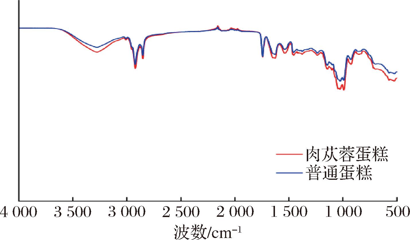 由图8可知,肉苁蓉蛋糕和普通蛋糕在贮藏7 d后进行FT-IR测定,能够反映淀粉的回生程度[33]。其中FT-IR波谱在 1 450~850 cm-1区域出现7个吸收峰,分别在935、985、1 345、1 577、1 099、1 175、1 473 cm-1附近,肉苁蓉蛋糕波谱的增加幅度小于普通蛋糕。结果表明,肉苁蓉蛋糕在贮藏7 d后的红外吸收峰强度比值均小于普通蛋糕,这与XRD测试结果一致,认为肉苁蓉的添加可以延缓蛋糕的老化。