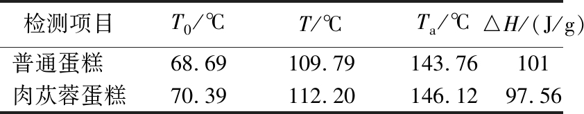 检测项目T0/℃T/℃Ta/℃△H/(J/g)普通蛋糕 68.69109.79143.76101肉苁蓉蛋糕70.39112.20146.1297.56