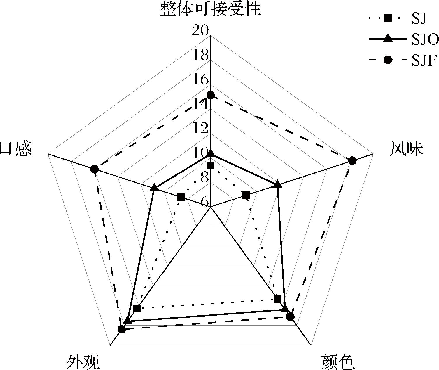 从整体可接受性、风味、颜色、外观和口感5个方面对不同样品进行感官评价,结果由图1所示。与SJ和SJO组相比,SJF组每项指标评分最高。在风味上,酯类化合物能为沙棘汁提供主要的花香和果香,SJF组得分最高原因可能与降酸发酵后沙棘汁酯类化合物显著增加有关。SJF组在颜色方面得分最高原因可能是毕赤酵母WJL-M4能将黄酮类大分子转化成的小分子[26],发酵过程中又能分泌甘露糖蛋白[33],两者结合使沙棘汁黄色变浓郁。在外观上,3个样品组得分差异不大。在口感上,3个样品组差异较大,这与沙棘汁总酸有关,经发酵后沙棘汁总酸显著降低。果汁中高含量的有机酸会形成难忍的酸感[23],经毕赤酵母WJL-M4发酵后,沙棘汁中pH值显著升高,总酸显著降低,进而改善尖锐酸味。降酸发酵后沙棘汁挥发性化合物显著增加赋予其更丰富风味,总酸显著降低明显改善口感使整体可接受度增加。
