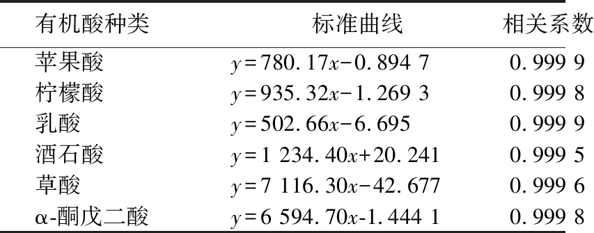 有机酸种类标准曲线相关系数苹果酸y=780.17x-0.894 70.999 9柠檬酸y=935.32x-1.269 30.999 8乳酸y=502.66x-6.6950.999 9酒石酸y=1 234.40x+20.2410.999 5草酸y=7 116.30x-42.6770.999 6α-酮戊二酸y=6 594.70x-1.444 10.999 8