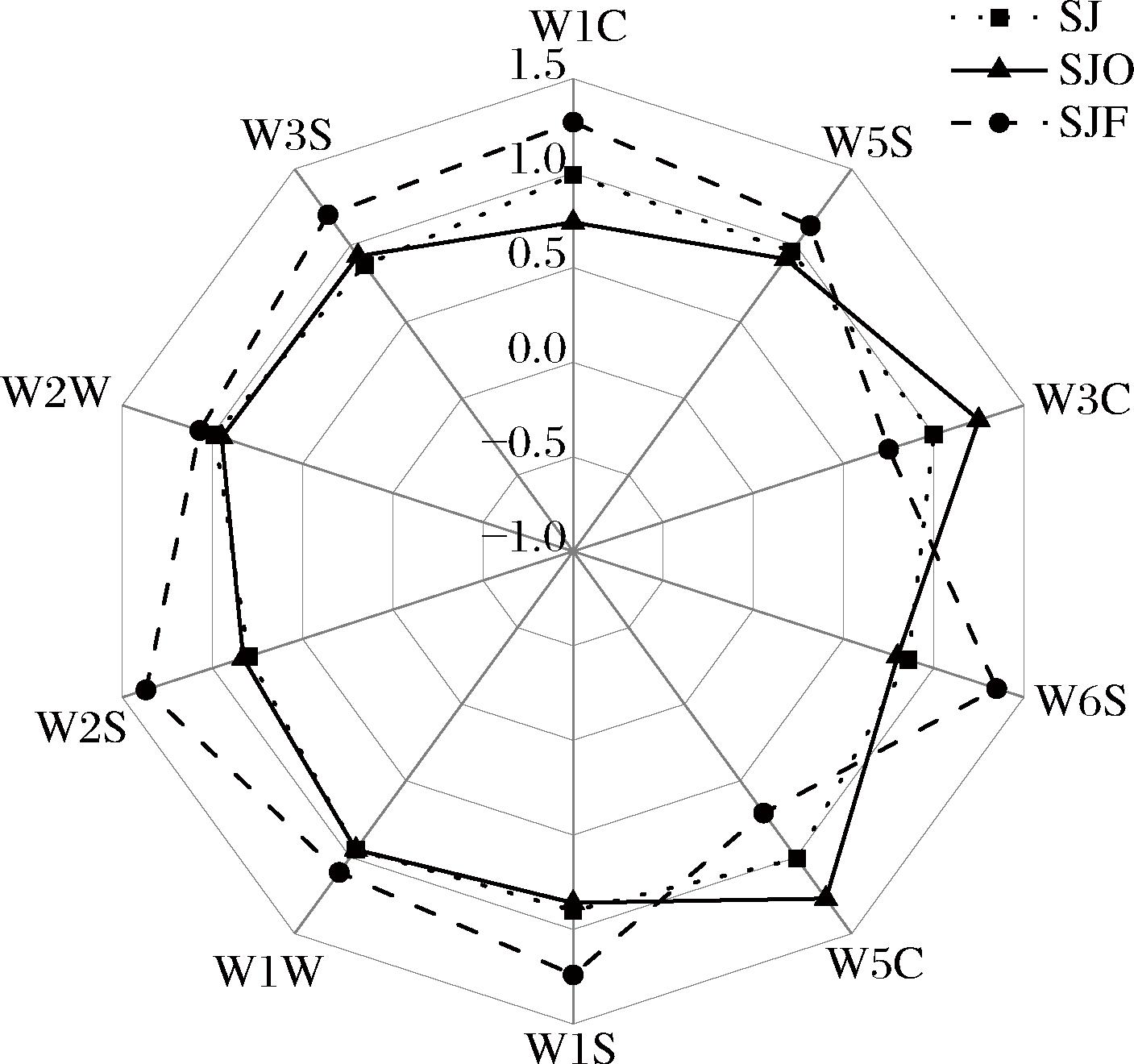 为探讨气味的差异,采用电子鼻技术对不同样品组进行分析,并将响应值归一化处理,各样品组在气味特征上的差异如图2所示。同一传感器对不同样品组的响应值表现出一定的差异性,SJF组与其他组差异最明显,除W3C和W5C外,其他传感器均对SJF组的响应值最高,表明降酸发酵沙棘汁样品中含有较高的芳烃化合物、氮氧化物、氢化物等。SJF组总响应值最高,表明毕赤酵母WJL-M4降酸发酵可能利于形成更复杂的香气特征[4]。