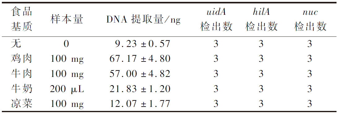 各含混合菌液的食品基质DNA提取及检测结果如表5所示,无食品基质样本提取得到(9.23±0.57) ng的DNA,其余样本提取量均高于无食品基质样本,说明除目标菌的DNA外,还提取到了食品基质本身所含有的DNA。检测结果显示,所有样本中均能检测到3种目标基因,表明该方法在面临真实食品样本时,仍有很好的检测效果。