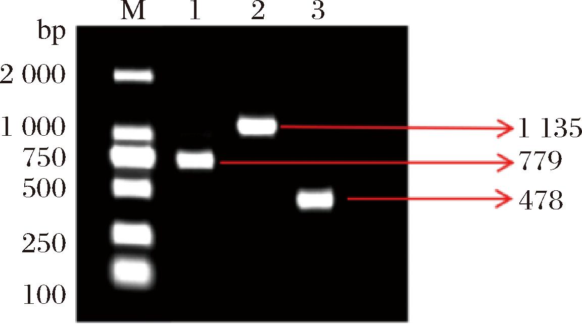 以3种目标菌的基因组DNA为模板,直接加入对应目标基因的内引物。扩增体系及反应条件参考表2,退火温度调整为60 ℃,其余条件不变。所得产物记为产物3。