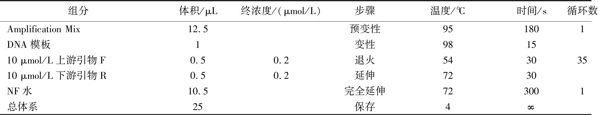 组分体积/μL终浓度/(μmol/L)步骤温度/℃时间/s循环数Amplification Mix12.5预变性951801DNA模板1变性981510 μmol/L上游引物F0.50.2退火54303510 μmol/L下游引物R0.50.2延伸7230NF水10.5完全延伸723001总体系25保存4∞
