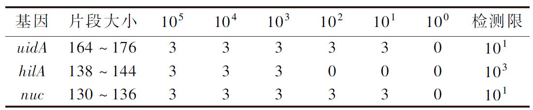 3种目标基因的胶回收浓度如下:uidA(779 bp)质量浓度5.42 ng/μL、hilA(1 135 bp)质量浓度为3.23 ng/μL、nuc(478 bp)质量浓度为4.87 ng/μL。回收结果如图6所示,所得片段明亮且单一,说明仅含目标基因片段,可作为后续实验中的阳性对照。将以上所得阳性对照按照表3稀释至105 copies/μL,用于后续灵敏度检测。