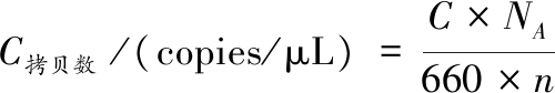 式中:C,质量浓度,g/μL;NA,阿伏伽德罗常数,6.022×1023;660,DNA碱基对平均分子质量;n,DNA链碱基对数。