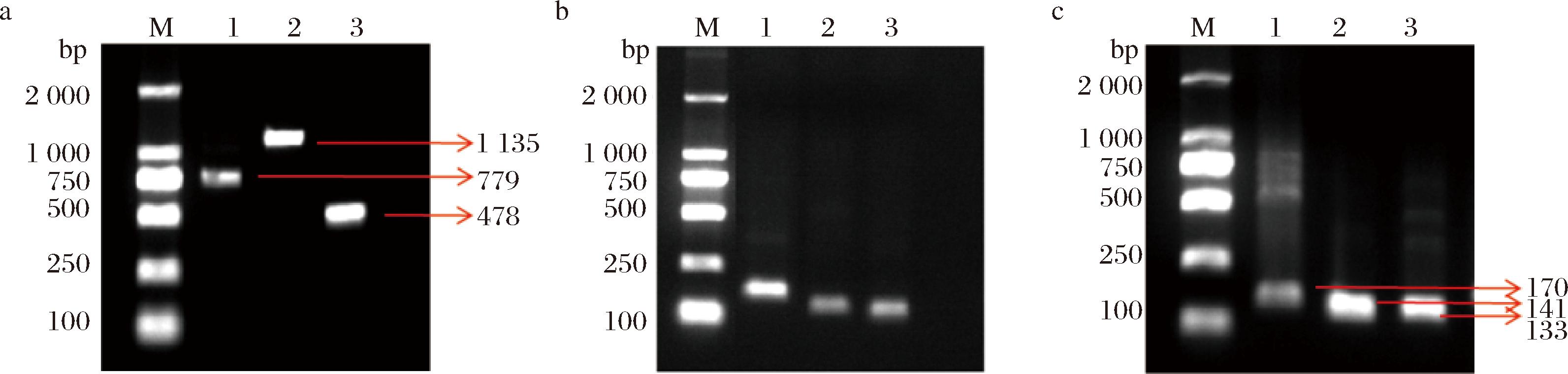 3种目标细菌基因的第一轮扩增结果如图2-a所示,结果显示大肠埃希氏菌(uidA)、鼠伤寒沙门氏菌(hilA)和金黄色葡萄球菌(nuc)的DNA分别在779、1 135、478 bp处出现扩增条带,与设计引物的目标片段长度一致,表明第一轮扩增满足后续实验要求。