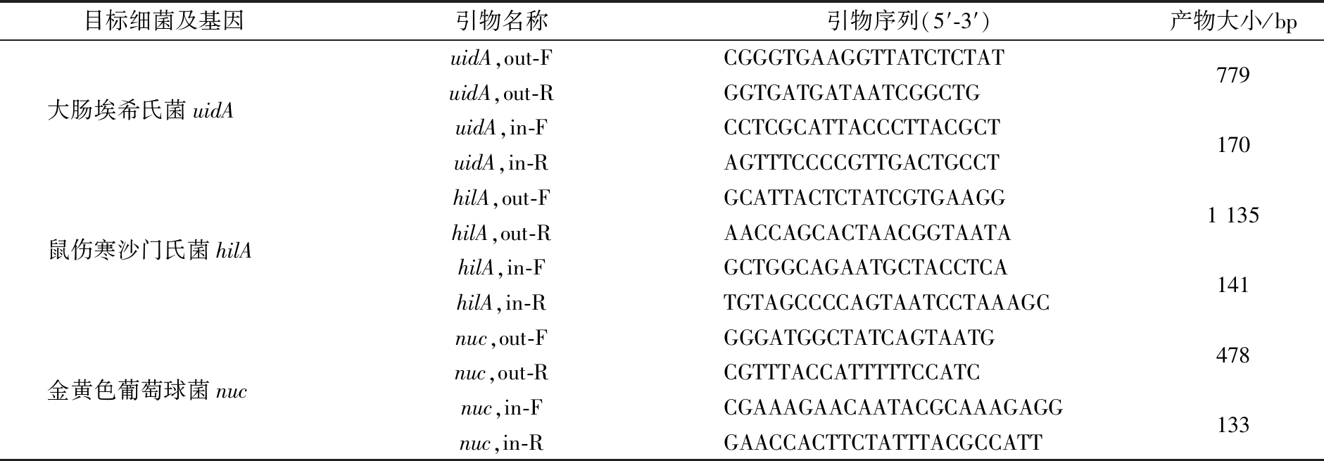 目标细菌及基因引物名称引物序列(5′-3′)产物大小/bp大肠埃希氏菌uidAuidA,out-FCGGGTGAAGGTTATCTCTAT779uidA,out-RGGTGATGATAATCGGCTGuidA,in-FCCTCGCATTACCCTTACGCT170uidA,in-RAGTTTCCCCGTTGACTGCCT鼠伤寒沙门氏菌hilAhilA,out-FGCATTACTCTATCGTGAAGG1 135hilA,out-RAACCAGCACTAACGGTAATAhilA,in-FGCTGGCAGAATGCTACCTCA141hilA,in-RTGTAGCCCCAGTAATCCTAAAGC金黄色葡萄球菌nucnuc,out-FGGGATGGCTATCAGTAATG478nuc,out-RCGTTTACCATTTTTCCATCnuc,in-FCGAAAGAACAATACGCAAAGAGG133nuc,in-RGAACCACTTCTATTTACGCCATT